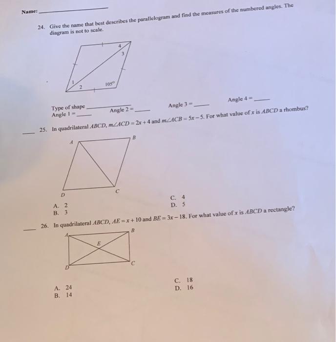 Angle 2- Angle 3 - Angle 4 - 25. Is a parallelogram with perpendicular diagonals. Has all sides congruent and all angles congruent d.